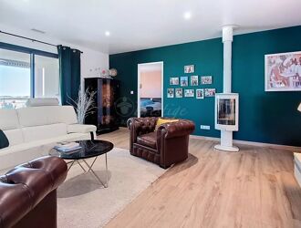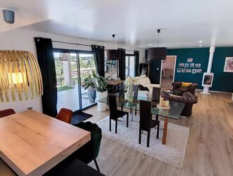 1 hall d'entrée, 1 salon/salle à manger avec poêle à bois doté d'une cuisine ouverte toute équipée avec accés direct à la terrasse couverte pour y organiser des tablées conviviales en famille et entre amis, 3 chambres dont une chambre suite avec salle de bains / d'eau - WC et dressing privé, + une 2 ème salle d'eau avec wc , et 1 bureau